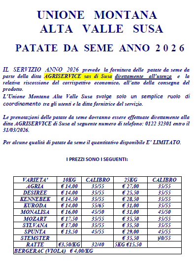 Le prenotazioni delle patate da seme dovranno essere effettuate direttamente alla ditta AGRISERVICE di Susa al seguente numero di telefono: 0122 32301 entro il 31/03/2026.