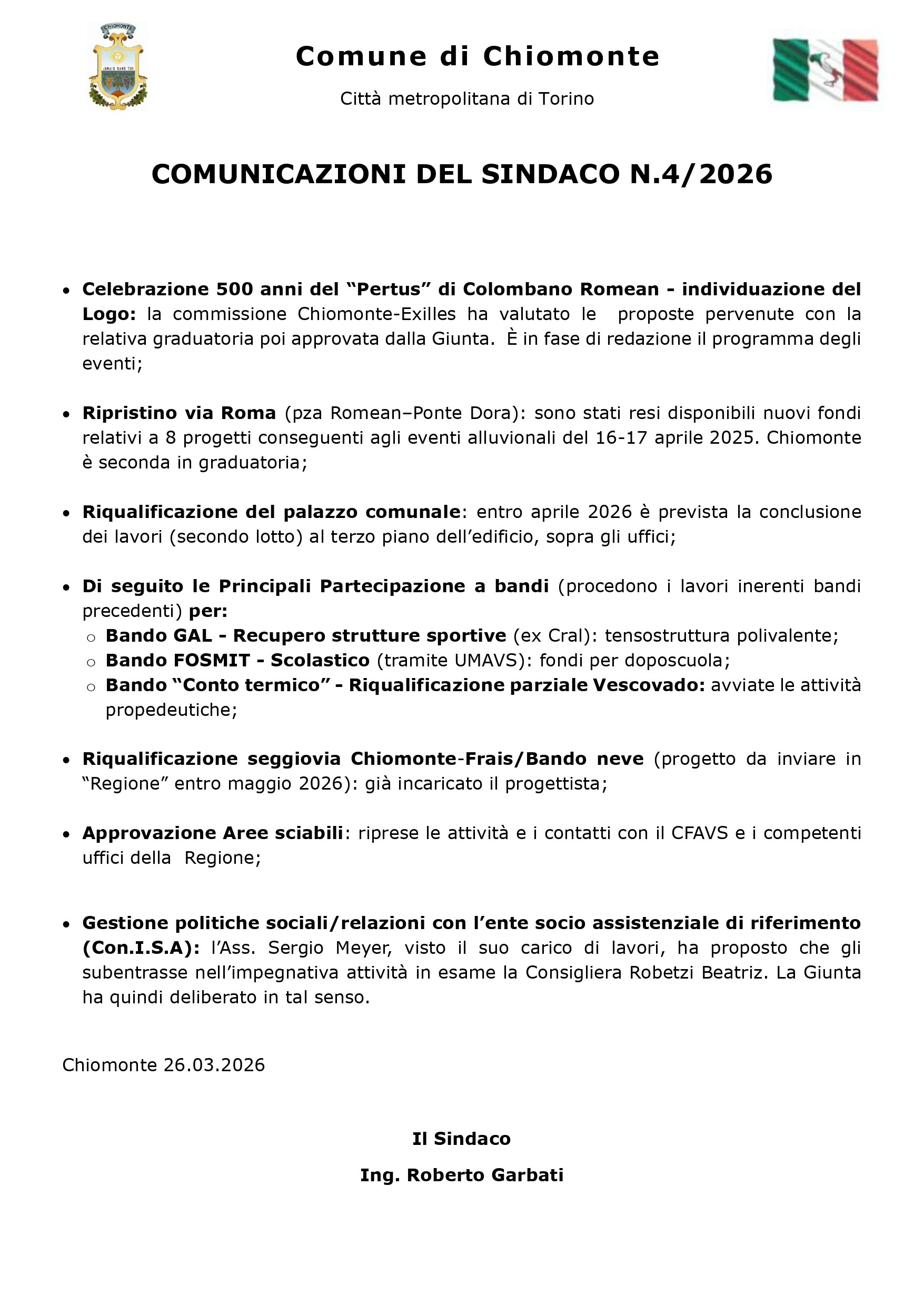 Comunicazioni del Sindaco n. 4/2026